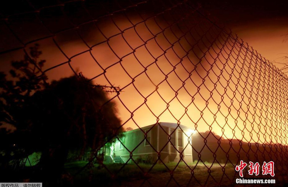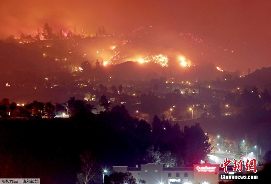 当地时间9月25日,美国加利福尼亚州坎宁地区的山上发生大火,火光冲天映红天际。